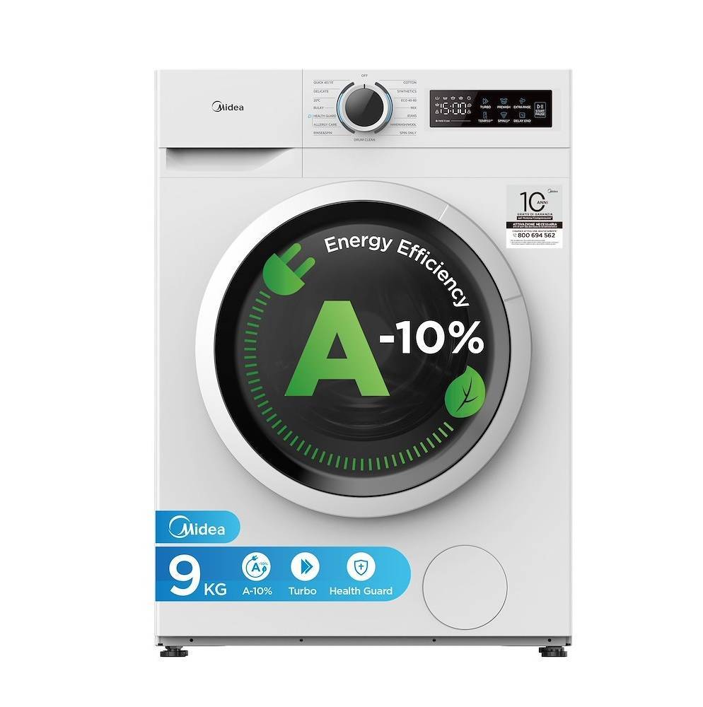 Articolo: MF110W90BA10W Marca: MIDEA Codice: 31052 Lavatrice Capacita 9KG, Classe A-10%, Inverter, Centrifuga 1400gg, Funzioni vapore, larg. 59.5 alt. 85 prof. 59.5 cm DISPONIBILI: 6 |  |