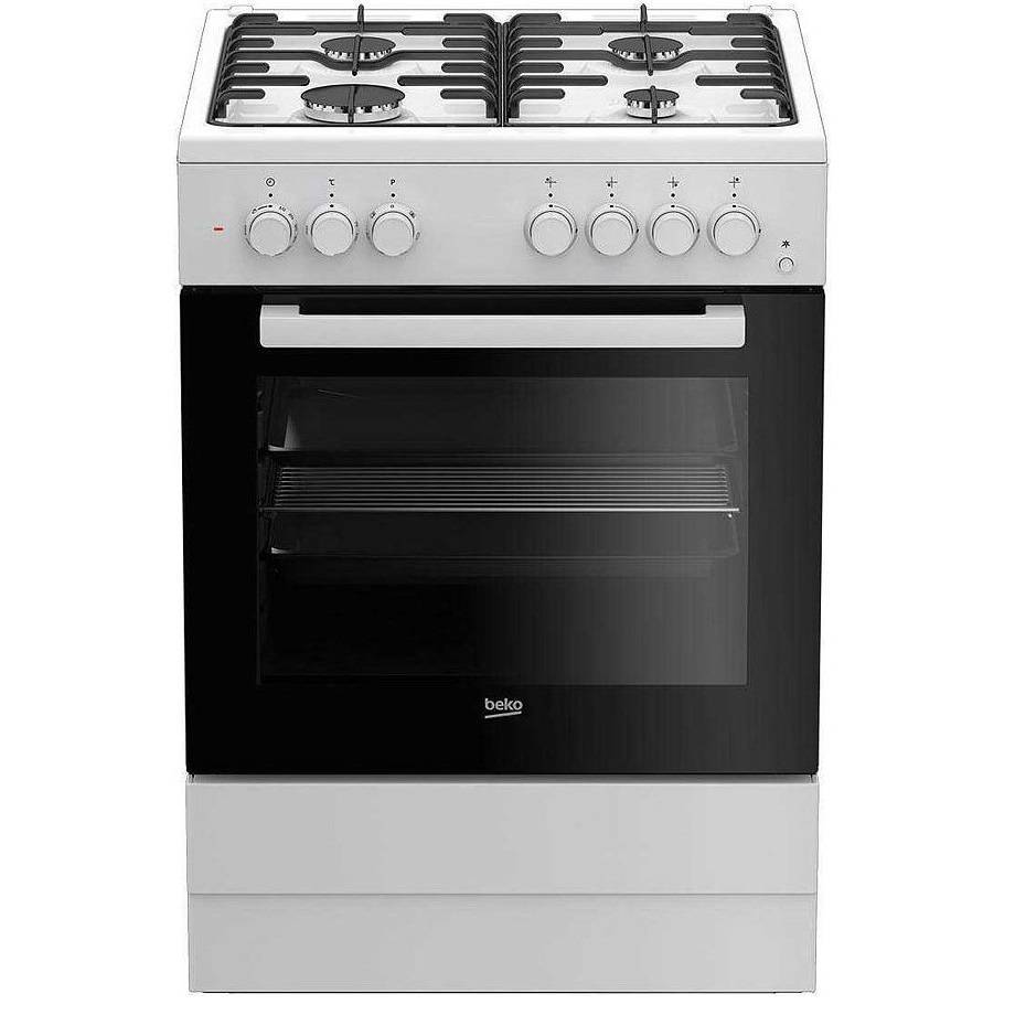 ARTICOLO: FBG62010DW MARCA: BEKO CODICE: 30467 Cucina 60x60 con piano a gas 4 fuochi classe A forno a gas 64lt. elettronica a pulsante 2 programmi cottura grill elettrico larg. 60 alt. 85 prof. 60 cm