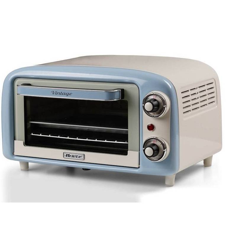ARTICOLO: 3919 CELESTE MARCA: ARIETE CODICE: 30334 Forno Elettrico Vintage, 800W, Capacità 10L, Doppio vetro, Retrò, timer, funzione grill, larg. 37 alt 21 prof. 31 cm